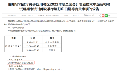 近日,本站编辑根据四川财政厅发布的“四川省财政厅关于四川考区2022年度全国会计专业技术中级资格考试延期考试时间及准考证打印日期等有关事项的公告”获知2022年四川中级会计师延考准考证打印时间11月25日至12月2日