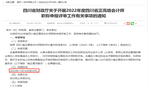 近日,本站编辑根据四川省财政厅发布的“四川省财政厅关于开展2022年度四川省正高级会计师职称申报评审工作有关事项的通知”获悉2022年四川正高级会计师职称评审申报时间为11月16日至30日。