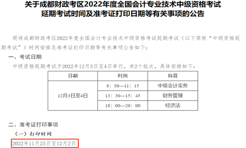 近日,本站编辑根据成都市会计学会网发布的“关于成都财政考区2022年度全国会计专业技术中级资格考试延期考试时间及准考证打印日期等有关事项的公告”获知2022年四川成都中级会计师延考准考证打印时间11月25日至12月2日。