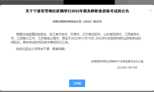 2022年11月15日,中国注册税务师协会发布了《关于宁波市等地区延期举行2022年税务师职业资格考试的公告》,2022年税务师考试延期地区有浙江省宁波市、天津市、辽宁省沈阳市,山东省菏泽市,江西省萍乡市、江西省九江市、江苏省连云港市。