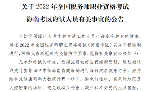 近日,中国注册税务师协会发布了《关于2022年全国税务师职业资格考试海南考区应试人员有关事宜的公告》,其中提到:考试当天,要求现场检测体温低于37.3°C,海南健康码为“绿码”(注意:后续每场考试进入考场前均需提供24小时内核酸检测阴性证明)。