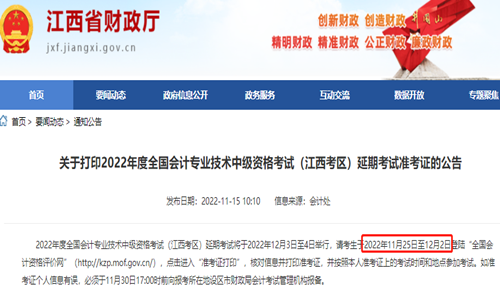 2022年度全国会计专业技术中级资格考试(江西考区)延期考试将于2022年12月3日至4日举行,请考生于2022年11月25日至12月2日登陆“全国会计资格评价网”(http://kzp.mof.gov.cn/),点击进入“准考证打印”,核对信息并打印准考证,并按照本人准考证上的考试时间和地点参加考试。如准考证个人信息有误,必须于11月30日17:00时前向报考所在地设区市财政局会计考试管理机构报备。