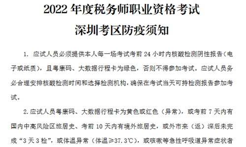 近日,中国注册税务师协会发布了《2022年度税务师职业资格考试深圳考区防疫须知》,其中提到:应试人员必须提供本人每一场考试考前24小时内核酸检测阴性报告(电子或纸质),且粤康码、大数据行程卡为绿色,否则不得参加考试。