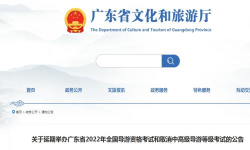 鉴于当前广东省疫情防控形势,为防止疫情扩散外溢,保障广大考生安全和健康,经请示文化和旅游部同意,决定延期举行广东考区2022年全国导游资格考试,取消广东考区2022年全国中高级导游等级考试。具体如下: