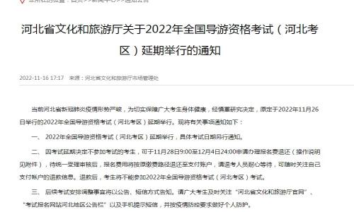 11月16日,河北省文化和旅游厅发布《河北省文化和旅游厅关于2022年全国导游资格考试(河北考区)延期举行的通知》,明确原定于11月26日举行的导游资格考试延期举行,具体时间请等待后续安排。
