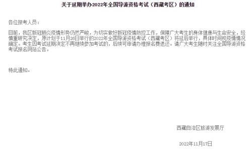 目前,我区新冠肺炎疫情形势仍然严峻,为切实做好新冠疫情防控工作,保障广大考生的身体健康与生命安全,经慎重研究决定,原计划于11月26日举行的2022年全国导游资格考试(西藏考区)将延后举行,具体时间视疫情情况确定。考生因考试延期决定不再继续参加考试的,后续可申请办理报名费退还。请广大考生随时关注全国导游资格考试报名网站公告。