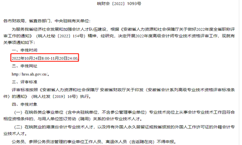 近日,本站编辑根据安徽省财政会计网发布的“安徽省财政厅关于开展2022年度高级会计师专业技术资格评审工作的通知”获悉安徽2022年高级会计师评审申报11月20日24:00截止。