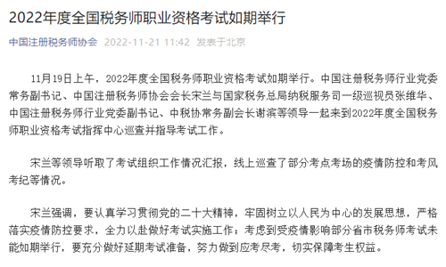 宋兰等领导听取了考试组织工作情况汇报,线上巡查了部分考点考场的疫情防控和考风考纪等情况。宋兰强调,要认真学习贯彻党的二十大精神,牢固树立以人民为中心的发展思想,严格落实疫情防控要求,全力以赴做好考试实施工作;考虑到受疫情影响部分省市税务师考试未能如期举行,要充分做好延期考试准备,努力做到应考尽考,切实保障考生权益。