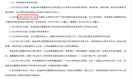 2023年6月20日至7月10日“全国会计资格评价网”中级资格考试报名系统开通。在上述时间内,各省级考试管理机构自行确定本地区的报名开始时间。考试报名统一在7月10日12:00截止,缴费统一在7月10日18:00截止。