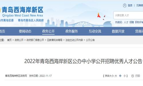 近日, 青岛西海岸新区政务网发布《2022年青岛西海岸新区公办中小学公开招聘优秀人才公告》,明确报名时间为2022年11月27日9:00—11月29日16:00,详细信息请考生关注官方信息。