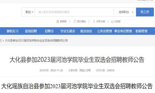 近日,河池人才网发布《大化县参加2023届河池学院毕业生双选会招聘教师公告》,明确报名时间为2022年11月26日(星期六)9:00-12:00,提醒考生按时报名。