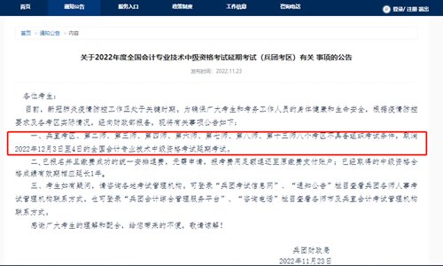 一、兵直考区、第二师、第三师、第四师、第六师、第七师、第八师、第十三师八个考区不具备组织考试条件,取消2022年12月3日至4日的全国会计专业技术中级资格考试延期考试。