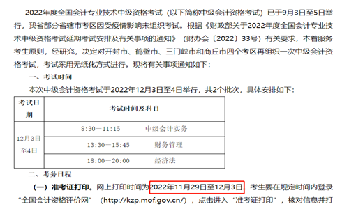 近日,本站编辑根据开封市财政厅发布的“关于2022年度全国会计专业技术中级资格考试(河南考区)延期考试有关事项的通知”获知2022年河南开封中级会计延考网上打印时间为2022年11月29日至12月3日。