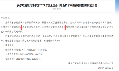 鉴于我省当前疫情防控形势严峻复杂,根据相关地区疫情防控要求,为切实保障广大考生的生命安全和身体健康,经相关部门审慎研判,决定取消哈尔滨市、大庆市和省直考点原定于2022年12月3日至4日举行的2022年度全国会计专业技术中级资格延期考试。