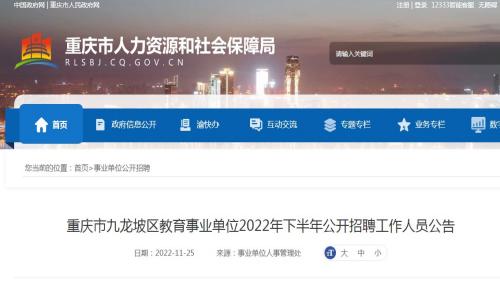 近日,重庆市人力资源和社会保障局发布《重庆市九龙坡区教育事业单位2022年下半年公开招聘工作人员公告》,明确报名时间为2022年11月30日 09:00 - 2022年12月04日 09:00,提醒考生按时报名。