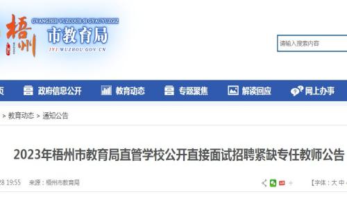 近日,广西梧州市教育局网站发布《2023年梧州市教育局直管学校公开直接面试招聘紧缺专任教师公告》,明确报名时间为公告发布之日起至2022年12月8日18点前,提醒考生按时报名。