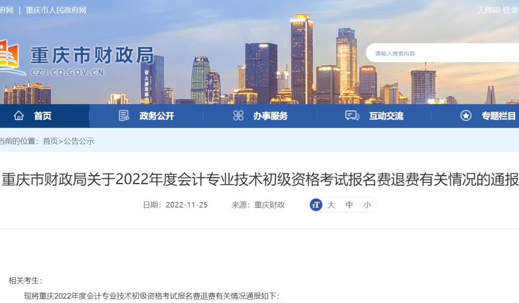 11月25日,重庆市财政局发布《关于2022年度会计专业技术初级资格考试报名费退费有关情况的通报》可知:我市因财政部变更考试时间登记退费的考生,已完成退费工作。请相关考生查询本人申请退费银行账户收入情况。如仍未收到退款的考生,请在恢复正常工作秩序后致电023-63216182,核对本人退费登记银行账户信息是否正确。