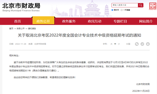 鉴于当前本市疫情防控形势,为切实保障广大考生的生命安全和身体健康,经研究,决定取消原定于12月3日至4日举行的北京考区2022年度全国会计专业技术中级资格延期考试。对于已通过资格审核且报名参加本次延期考试的考生,我们将退还报名费,并将2021年已取得的合格成绩有效期延长1年(具体办理事宜另行通知)。