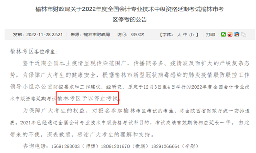 鉴于近期全国本土疫情呈现传染范围广、传播链条多、疫情波及面扩大的严峻复杂态势,为保障广大考生的健康安全,根据榆林市新型冠状病毒感染的肺炎疫情联防联控工作领导小组办公室防控要求和工作建议,经研究,原定于12月3日至4日举行的2022年度全国会计专业技术中级资格延期考试榆林考区予以停止考试。
