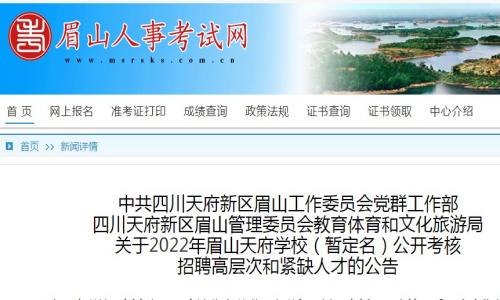 近日,眉山人事考试网发布《2022年眉山天府学校(暂定名)公开考核招聘高层次和紧缺人才的公告》,明确报名时间为2022年11月29日至2022年12月25日。,提醒考生按时报名。