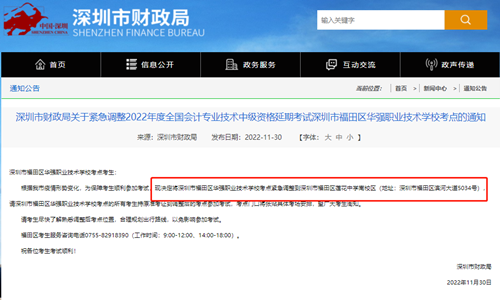 近日,本站编辑根据深圳市财政局发布的“深圳市财政局关于紧急调整2022年度全国会计专业技术中级资格延期考试深圳市福田区华强职业技术学校考点的通知”获知福田区华强职业技术学校考点紧急调整到深圳市福田区莲花中学南校区,考生请知悉。