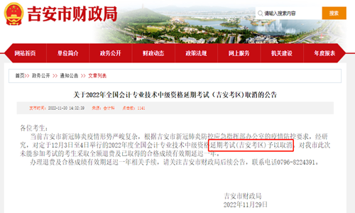 近日,本站编辑根据吉安市财政局发布的“关于2022年全国会计专业技术中级资格延期考试(吉安考区)取消的公告”获知定于12月3日至4日举行的2022年度全国会计专业技术中级资格延期考试(吉安考区)予以取消。