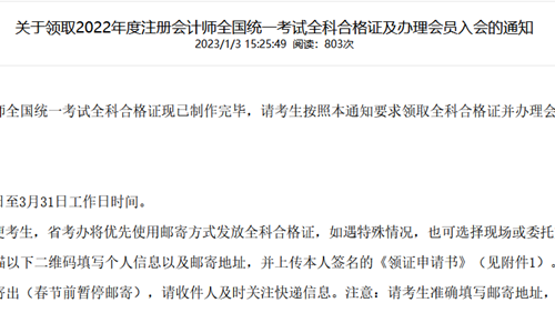 山东省2022年注册会计师全国统一考试全科合格证现已制作完毕,请考生按照本通知要求领取全科合格证并办理会员入会手续。相关注意事项通知如下: