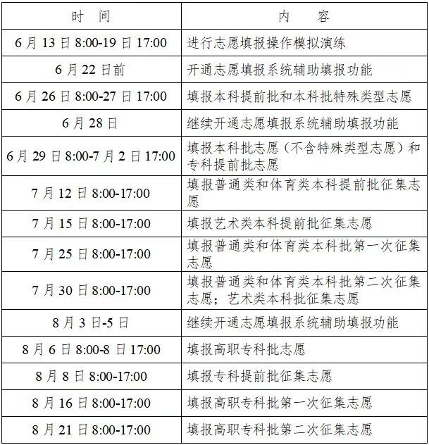 7月5日至8日,填报普通类特殊类型批志愿;填报普通类常规批和体育类常规批第1次志愿;填报艺术类本科批第1次志愿;填报春季高考技能拔尖人才第1次志愿和春季高考本科批第1次志愿。