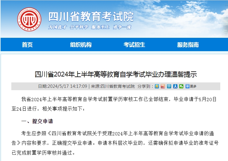 附件:《四川省教育考试院关于受理2024年上半年高等教育自学考试毕业申请的通告》