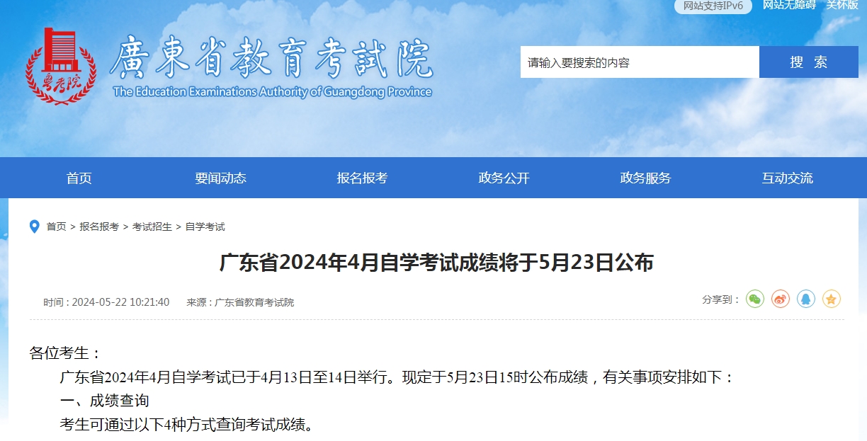 广东省2024年4月自学考试已于4月13日至14日举行。现定于5月23日15时公布成绩,有关事项安排如下: