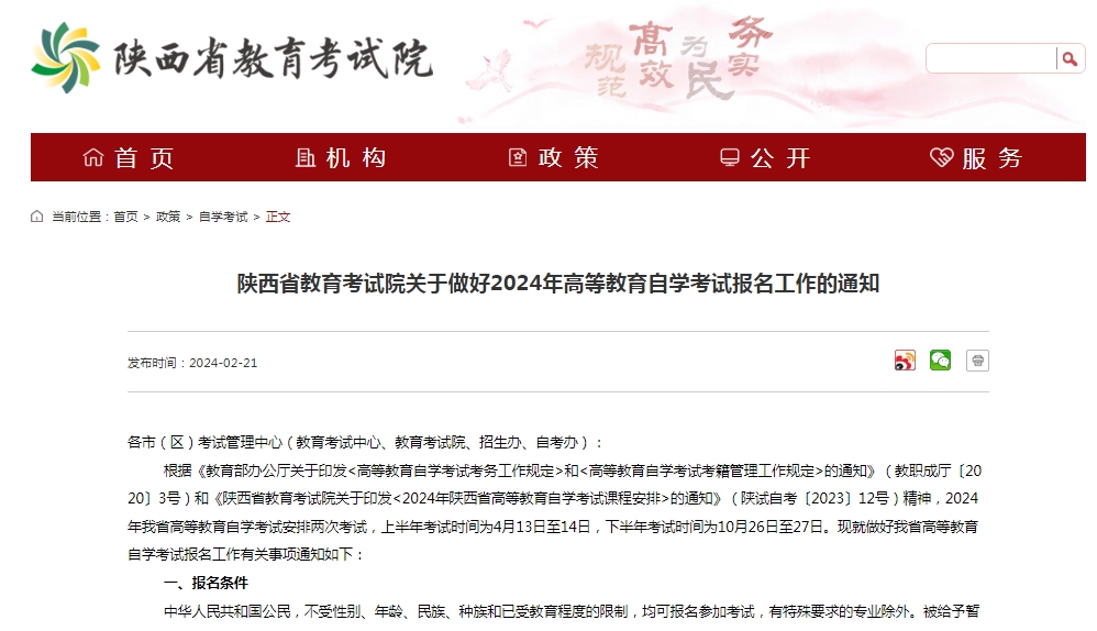 根据《教育部办公厅关于印发<高等教育自学考试考务工作规定>和<高等教育自学考试考籍管理工作规定>的通知》(教职成厅〔2020〕3号)和《陕西省教育考试院关于印发<2024年陕西省高等教育自学考试课程安排>的通知》(陕试自考〔2023〕12号)精神,2024年我省高等教育自学考试安排两次考试,下半年考试时间为10月26日至27日。现就做好我省高等教育自学考试报名工作有关事项通知如下: