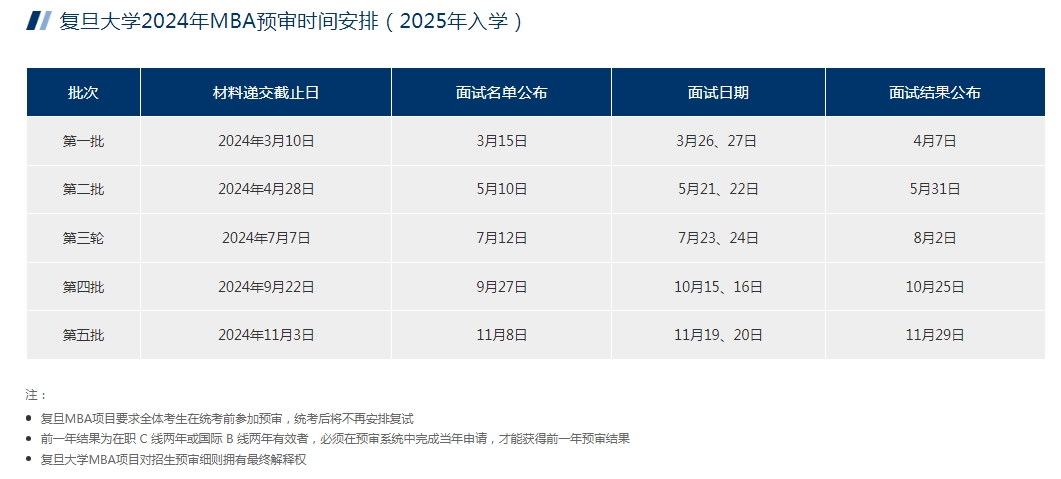 复旦大学2024年MBA预审时间安排(2025年入学)
