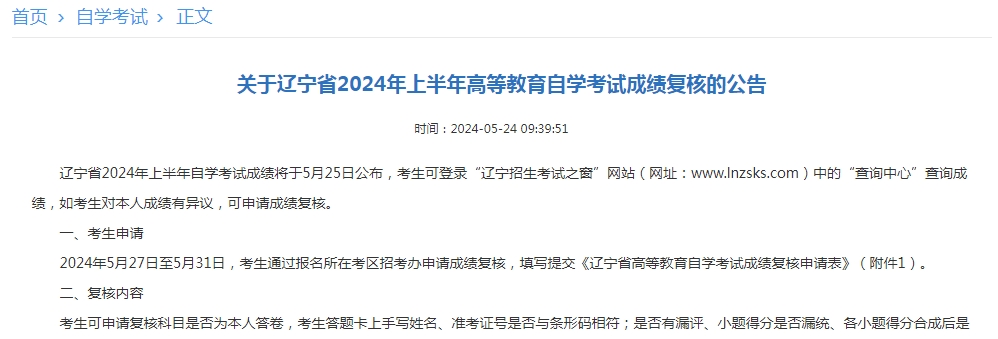 2024年5月27日至5月31日,考生通过报名所在考区招考办申请成绩复核,填写提交《辽宁省高等教育自学考试成绩复核申请表》(附件1)。