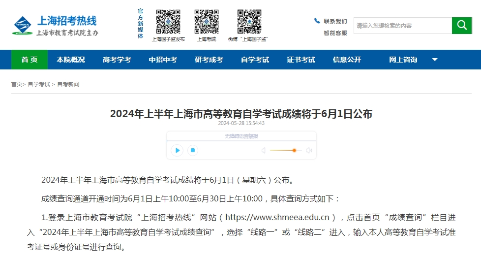 2024年上半年上海市高等教育自学考试成绩将于6月1日(星期六)公布。