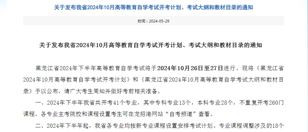 1.黑龙江省2024年10月高等教育自学考试开考计划
