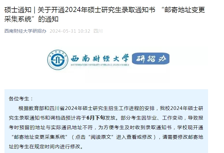 根据教育部和四川省2024年硕士研究生招生工作进程的安排,我校2024年硕士研究生录取通知书和调档函预计将于6月下旬发放。部分考生因毕业、工作变动,导致报考时预留的地址与实际通讯地址不符,为方便考生及时收到录取通知书,学校现开通邮寄地址变更采集系统请需要修改邮寄地址的考生在规定时间内进行修改。