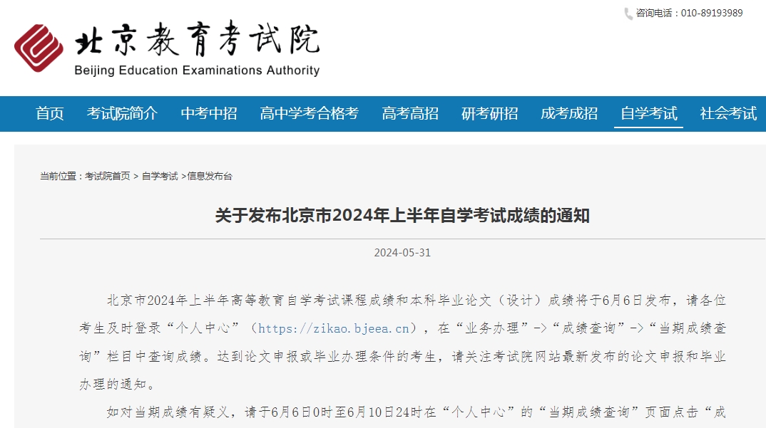 北京市2024年上半年高等教育自学考试课程成绩和本科毕业论文(设计)成绩将于6月6日发布,请各位考生及时登录个人中心(https://zikao.bjeea.cn),在业务办理->成绩查询->当期成绩查询栏目中查询成绩。达到论文申报或毕业办理条件的考生,请关注考试院网站最新发布的论文申报和毕业办理的通知。
