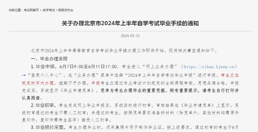1. 毕业申报。6月7日9:00至6月11日17:00,考生进入网上业务办理(https://zikao.bjeea.cn)登录个人中心,在业务办理菜单中选择2024年上半年自学考试毕业申报进行申报。考生应在规定时间内办理,逾期不予办理。申报考生应通过专业考试计划规定的全部课程考核,思想品德合格。申报完成后,系统显示《毕业申请凭单》。凭单为考生办理毕业的重要凭据,附有重要提示,请考生自行打印并认真阅读。
