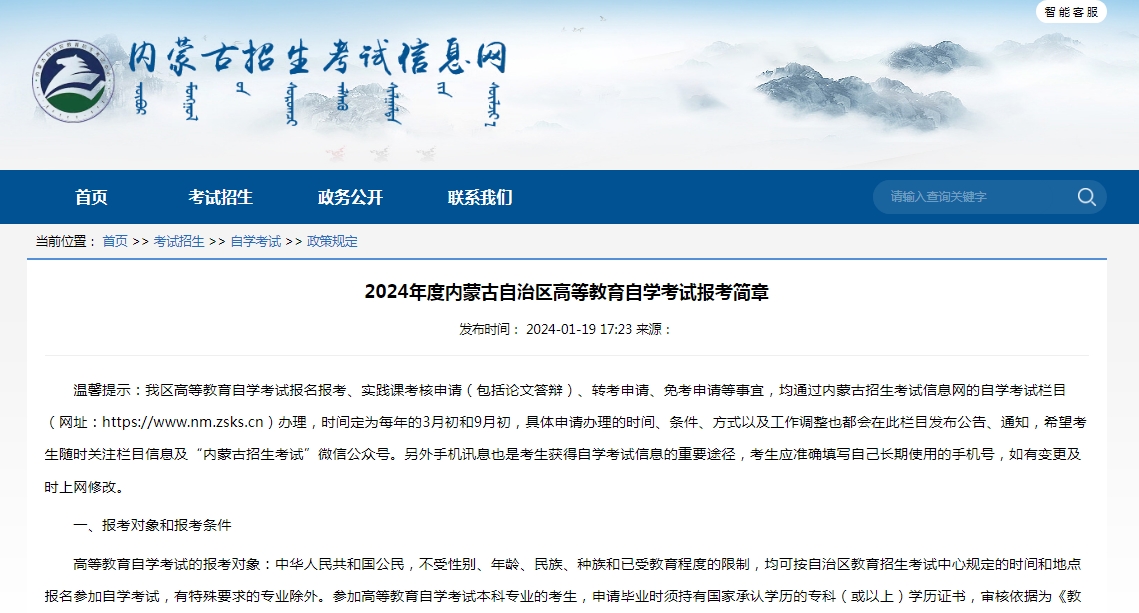 温馨提示:我区高等教育自学考试报名报考、实践课考核申请(包括论文答辩)、转考申请、免考申请等事宜,均通过内蒙古招生考试信息网的自学考试栏目(网址:https://www.nm.zsks.cn)办理,时间定为每年的3月初和9月初,具体申请办理的时间、条件、方式以及工作调整也都会在此栏目发布公告、通知,希望考生随时关注栏目信息及内蒙古招生考试微信公众号。另外手机讯息也是考生获得自学考试信息的重要途径,考生应准确填写自己长期使用的手机号,如有变更及时上网修改。
