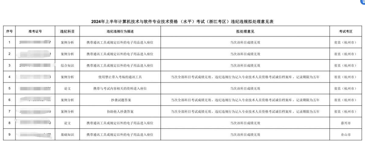 2024年上半年计算机技术与软件专业技术资格(水平)考试(浙江考区)违纪违规拟处理公告