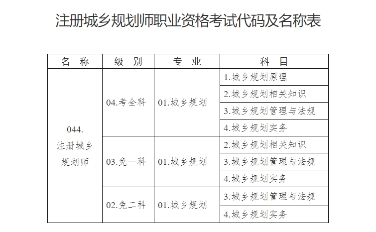 注册城乡规划师职业资格考试代码及名称表