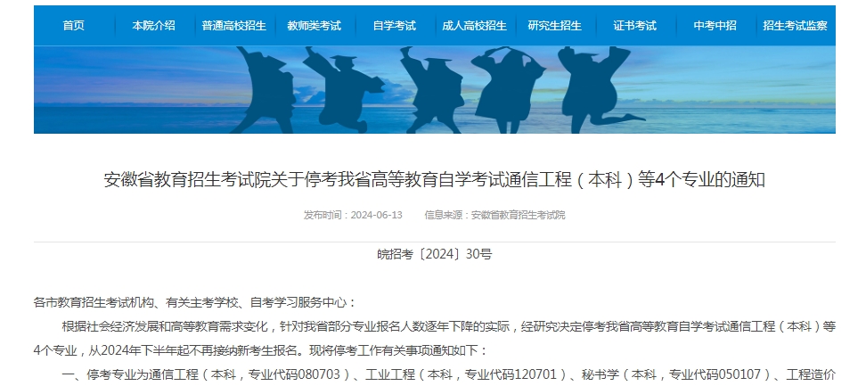 根据社会经济发展和高等教育需求变化,针对我省部分专业报名人数逐年下降的实际,经研究决定停考我省高等教育自学考试通信工程(本科)等4个专业,从2024年下半年起不再接纳新考生报名。现将停考工作有关事项通知如下: