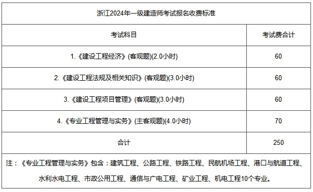 缴费入口为中国人事考试网(同报名入口),请考生们登录该网站进行缴费操作。根据浙江人事考试网通知,其2024年一级建造师考试各科目收费金额如下: