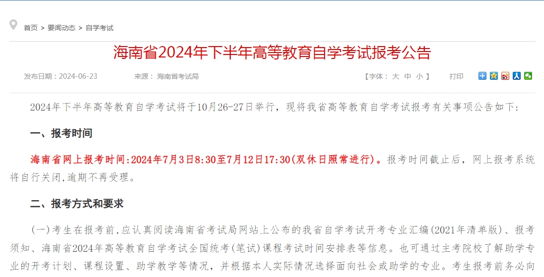 海南省网上报考时间:2024年7月3日8:30至7月12日17:30(双休日照常进行)。报考时间截止后,网上报考系统将自行关闭,逾期不再受理。