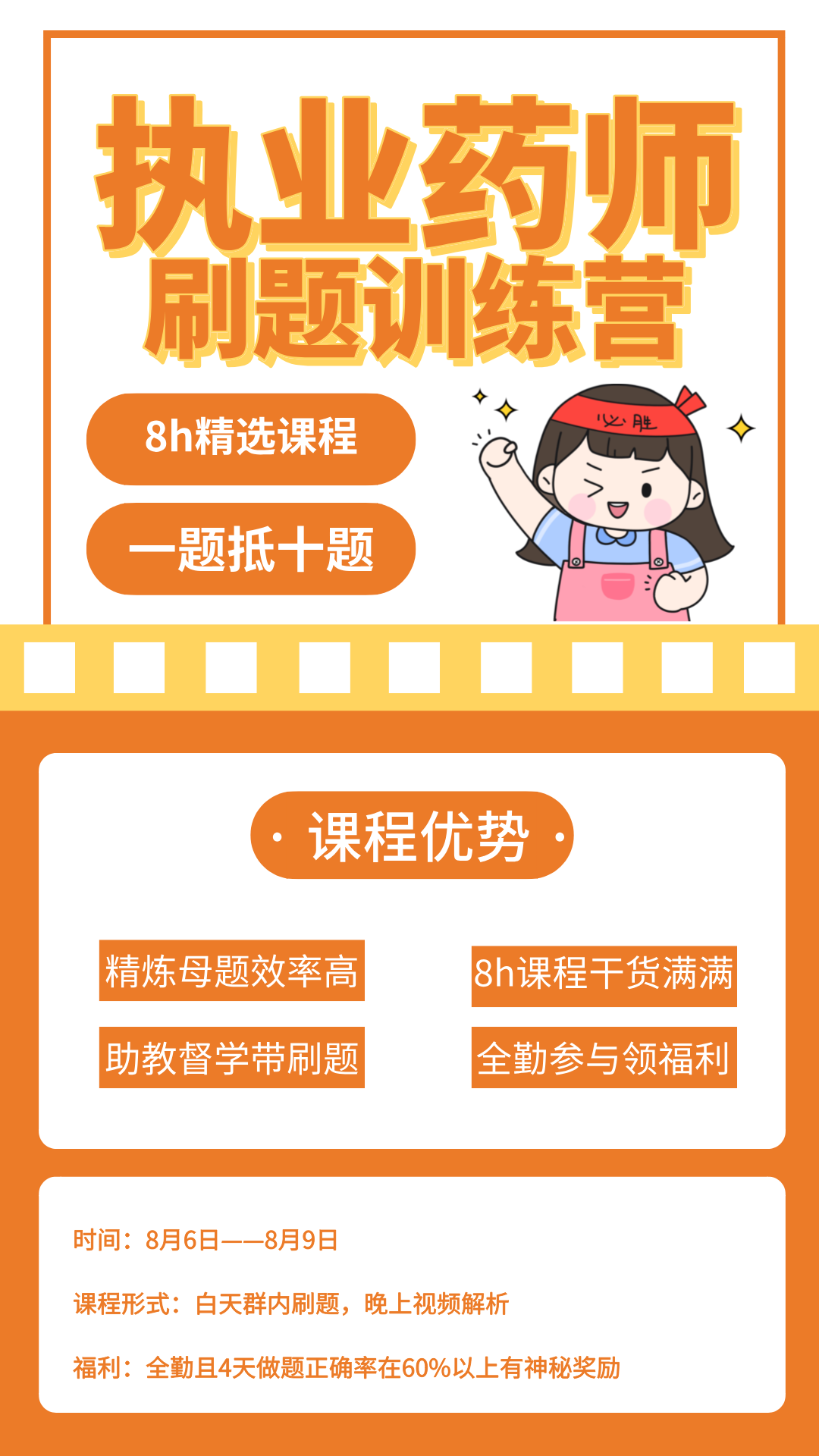 2024年执业药师资格考试时间为10月19日至20日,想要在2024年执业药师考试中取得好成绩,就需要在备考过程中多刷题,熟悉考试题型,掌握考试技巧。为此,环球网校特意为考生们准备了“2024年执业药师母题刷题训练营”,8月6日至9日期间可免费领取学习。