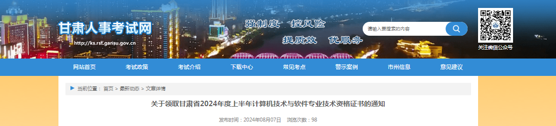 关于领取甘肃省2024年度上半年计算机技术与软件专业技术资格证书的通知