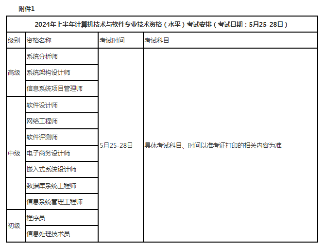 1.2024年上半年计算机技术与软件专业技术资格(水平)考试安排(考试日期:5月25-28日)