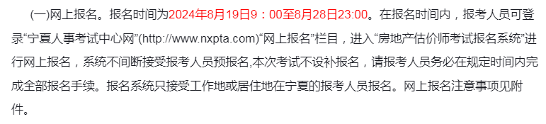 2024年宁夏房地产估价师报名时间为8月19日9:00至8月28日23:00,请各位考生在规定时间内准时报名。