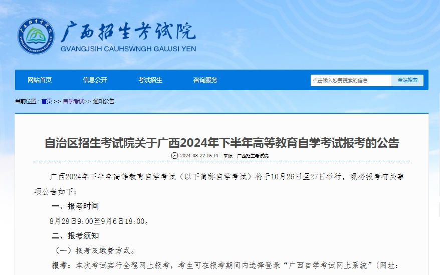 广西2024年下半年高等教育自学考试(以下简称自学考试)将于10月26日至27日举行,现将报考有关事项公告如下: