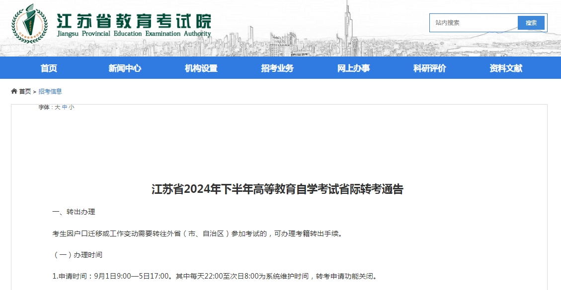 1.考生在规定时间内,自行登录江苏省教育考试院网站(www.jseea.cn)招考业务栏目自学考试页面,点击考生入口,在新页面点击全部考试项目,选择2024年下半年省际转考,查询转入信息。